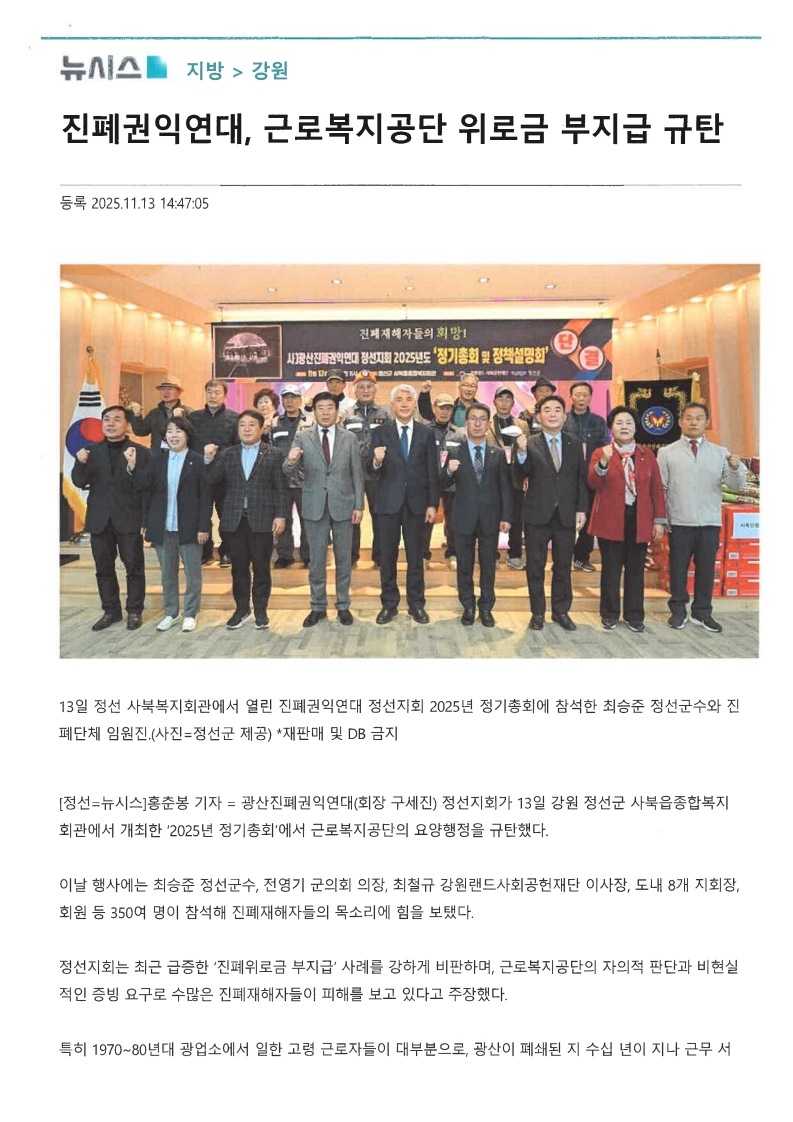 “근로복지공단 진폐위로금 부지급 결정 규탄”유주현2025. 11. 14. 00:08요약보기음성으로 듣기번역 설정글씨크기 조절하기인쇄하기광산진폐권익연대 정선지회 성명▲ 광산진폐권익연대 정선지회(지회장 구세진)는 13일 사북종합복지관에서 정기총회를 열고 진폐위로금 부지급 결정을 내린 근로복지공단을 규탄하는 성명서를 발표했다.광산진폐권익연대 ...